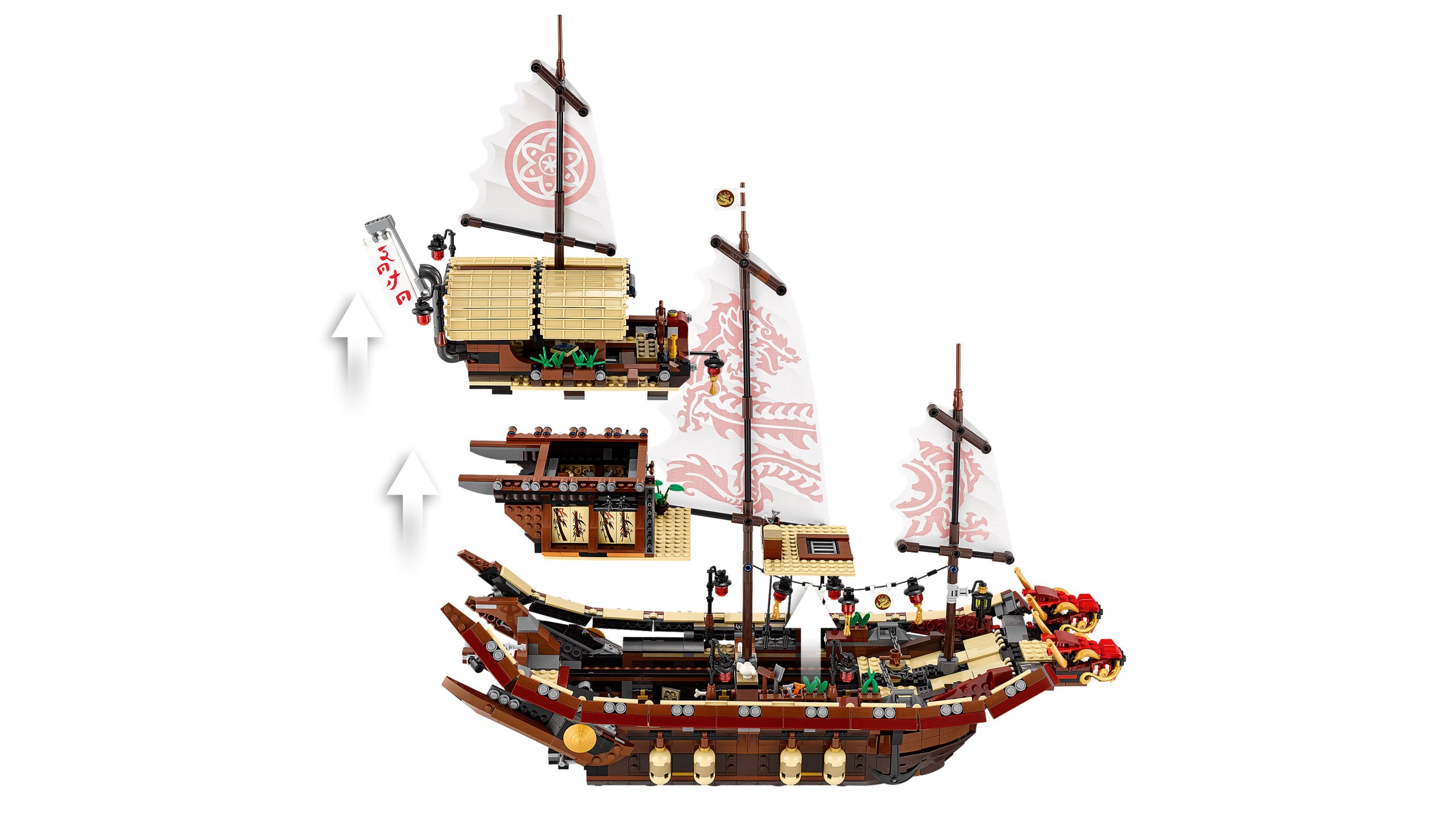 Zbuduj ogromną bazę szkoleniową dla ninja — Perłę Przeznaczenia. Ten niezwykle szczegółowy model z filmu LEGO® NINJAGO®: FILM™ składa się z trzech modułowych poziomów. Statek ma galion w kształcie dwugłowego smoka, dekorowane żagle, podnoszone i opuszczane kotwice, dojo szkoleniowe dla ninja oraz łazienkę i sypialnię Wu w kadłubie. Model zawiera też ukryte uzbrojenie, w tym broń ostateczną — laserowy wskaźnik — oraz siedem minifigurek z bronią, dzięki czemu zabawa będzie jeszcze ciekawsza.
