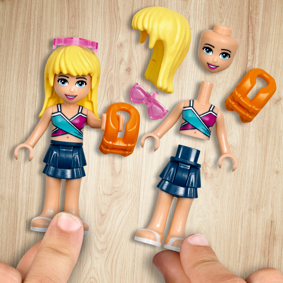Zestaw LEGO® Friends 41347 Kurort w Heartlake zapewni Ci doskonałą zabawę i odpoczynek w Mieście Heartlake! W hotelu znajduje się lobby, restauracja, bar z sokami, taras ze stanowiskiem dla DJ-a oraz dwie sypialnie. Kolejką jednoszynową można pojechać do parku wodnego z przebieralnią, dwiema zjeżdżalniami wodnymi i przechylanym wiadrem, z którego wylewa się wodospad. Jest tu także fragment plaży ze skuterem wodnym, spadochronem holowanym i stanowiskiem ratownika. Ten wspaniały zestaw LEGO Friends zawiera cztery minilaleczki i figurkę delfina.