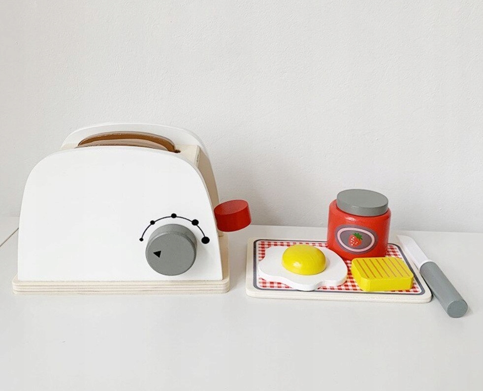 Piękny, drewniany toster z ruchomymi elementami i zestawem akcesoriów, które pozwolą przyszykować pyszne śniadanie.