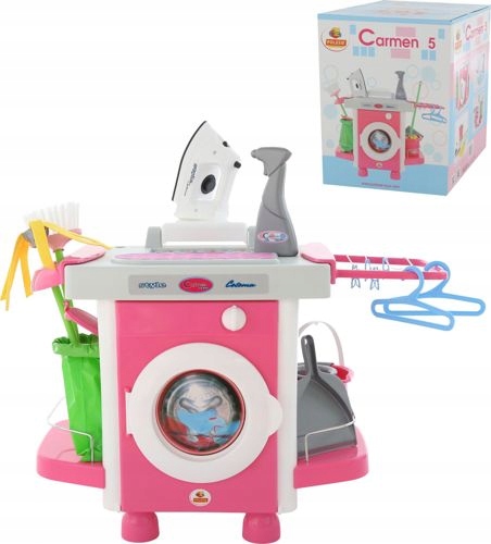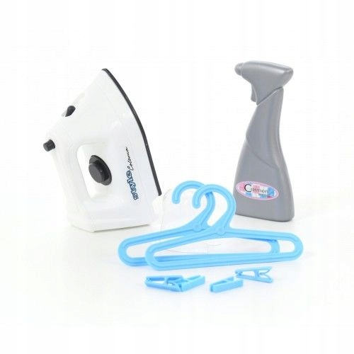 żelazko, dwa wieszaki na ubrania, cztery spinacze do prania, wiadro z koszykiem do wyciskania nadmiaru wody, szczotkę, mop, szufelkę oraz butelkę imitującą płyn do sprzątania brudnych powierzchni