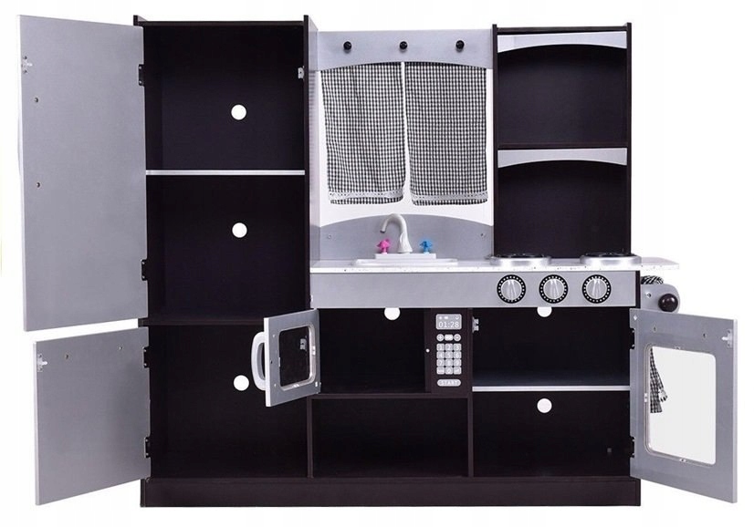 Srebrno-czarna kuchnia dla dzieci wykonana jest na wzór prawdziwej kuchni — zawarto w niej realistyczne elementy, dzięki którym kilkulatek oswoi się z bezpieczną pracą w domowej kuchni. Budowa i konstrukcja zabawki będzie atrakcyjnym i przyciągającym wzrok elementem wystroju pokoju dziecka — sprawdzi się zarówno w dziewczęcym, jak i chłopięcym kąciku. Co więcej — imponujące wymiary kuchni sprawiają, że będzie to fantastyczny zestaw dla rodzeństwa lub dziecka i jego przyjaciół, a materiały, jakich użyto do produkcji zestawu, są przyjazne dla środowiska, odporne na zabrudzenia i trwałe.