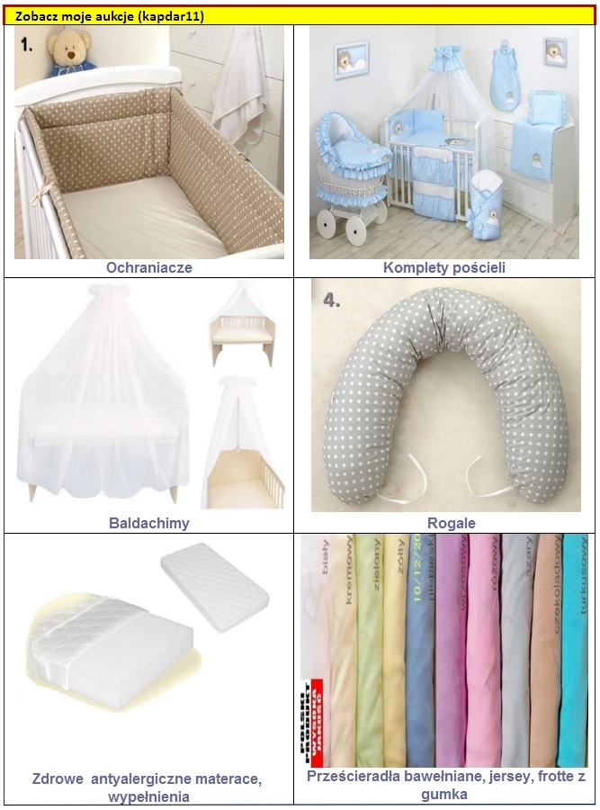 Zapraszamy Państwa do odwiedzania pozostałych naszych aukcji, na których oferujemy pościel i wypełnienia z innych kolekcji do łóżeczka, wózka, poduszki (rogale) do karmienia, zdrowe materace, pokrowce, śpiworki, rożki, prześcieradła, ręczniki, wsporniki a także wiele innych artykułów. Realizujemy również indywidualne zamówienia.