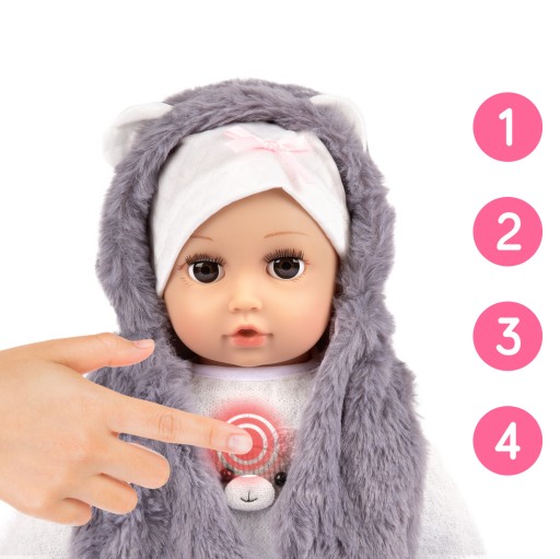 - Батарейки в комплекті. Перед використанням потрібно витягнути захист, який буде запускати ляльку.