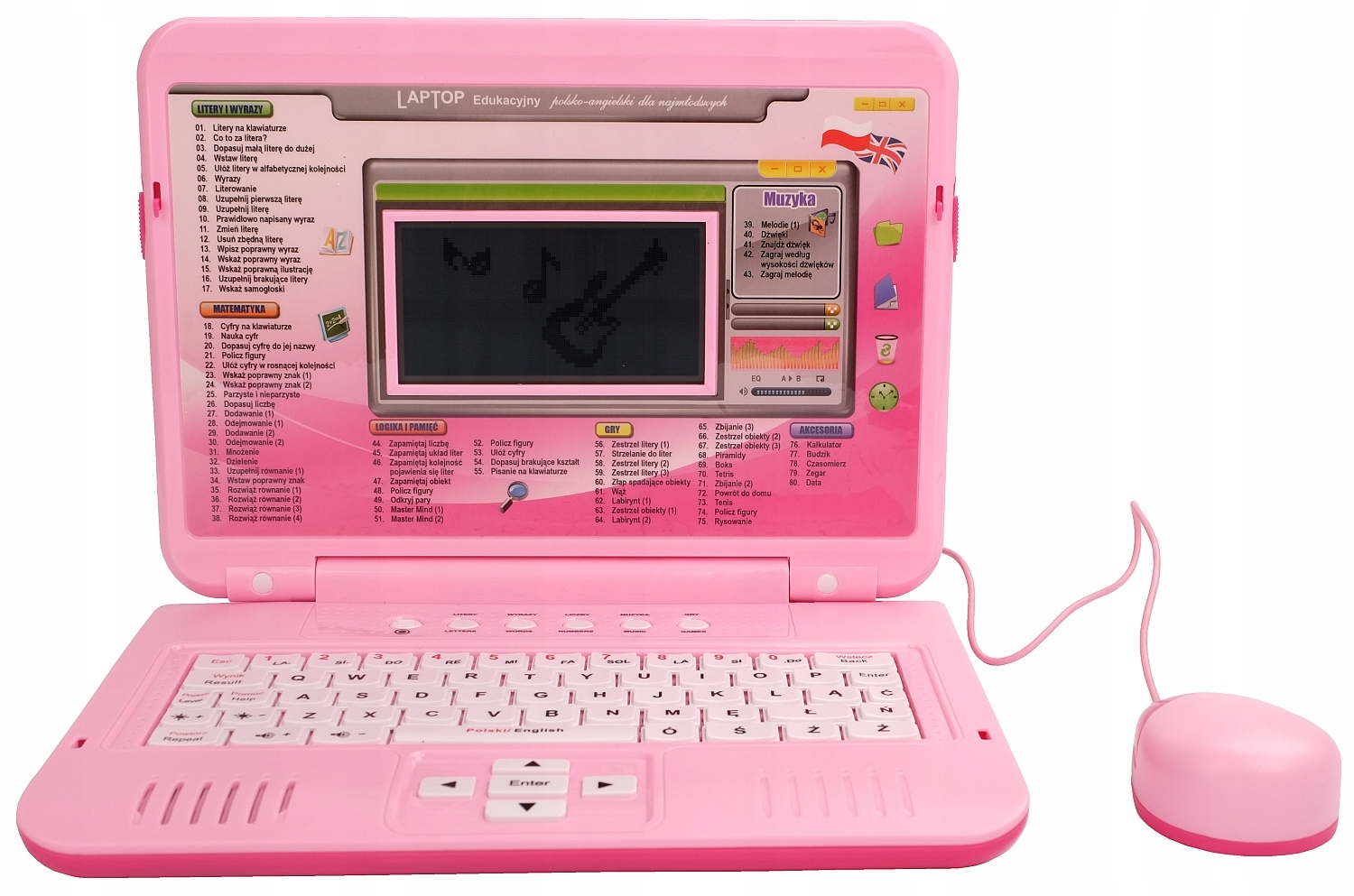 Realistyczna klawiatura zawiera wszystkie litery alfabetu polskiego w tym znaki diakrytyczne - ą, ć, ś, ę itd. Myszka z funkcjami kursora oraz klawiszem enter i esc. Myszkę można odłączyć. Bezpieczny ekran LCD. Klawisze grup programów ułatwią dziecku dostęp do poszczególnych zadań. Laptop posiada także regulację głośności oraz jasności ekranu.