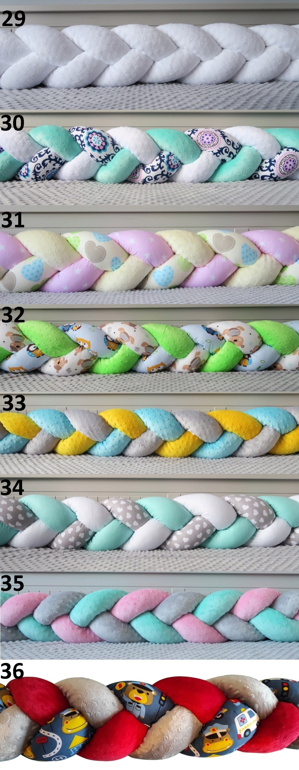 składa się z trzech osobnych elementów tzw. wałków,zaplecionych w uroczy warkocz.Warkocz może być wykonany z pluszu minky lub ze 100% bawełny. Ochraniacz jest wypełniony najwyższej jakości antyalergicznym puchem silikonowym (Lentex - Certyfikat Oeko Tex 100).