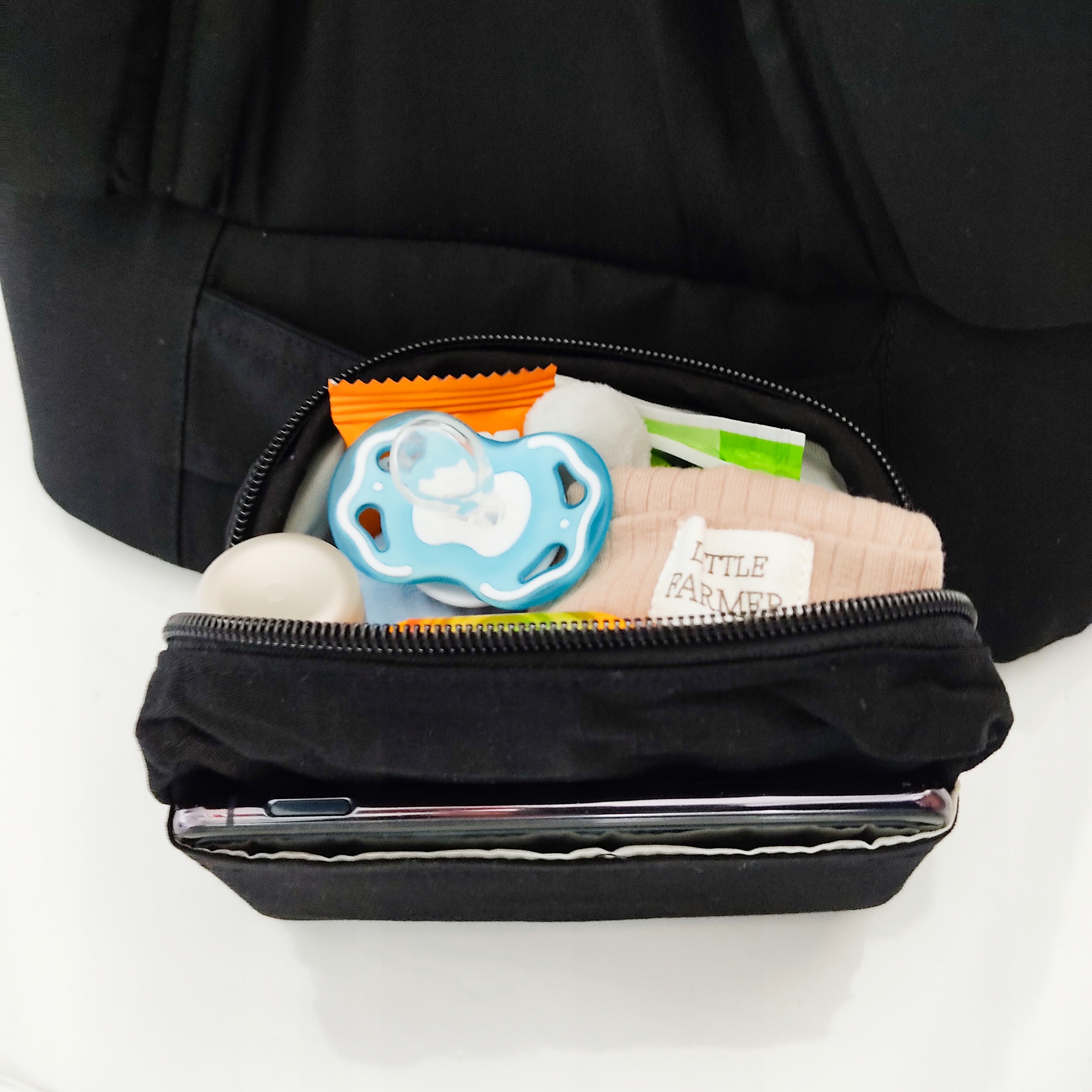 - Dodatkowa torebka montowana na rzep do pasa biodrowego z przodu, która pomieści: telefon, klucze, chusteczki, krem, smoczek, pieluszkę, itp.