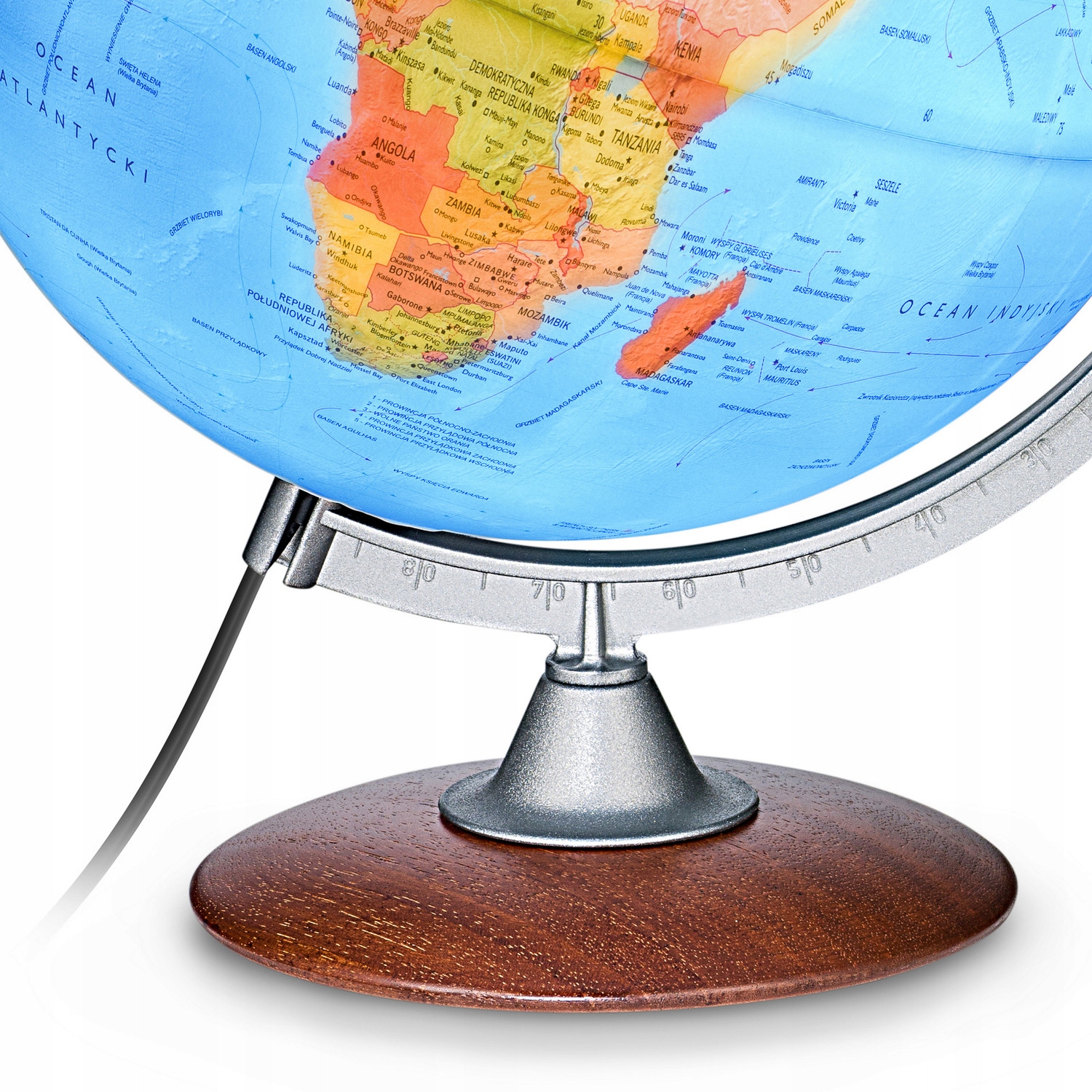 Montowany na plastikowej drewnianej i meridianie. Mapa w języku polskim. Wielkość kuli 30 cm, wysokość 38 cm. Łatwa wymiana żarówki.