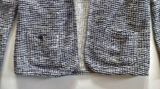 Предмет аукціону куртка ZARA чорно-білого кольору з додаванням золотистої нитки, переплетена з шерстю, без підкладки, кишені з боків на гудзиках.