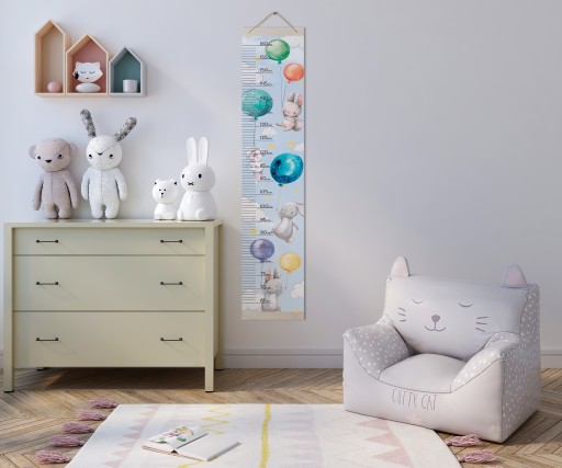 Різнокольорові таблиці зросту з зайчиками, що літають на повітряних кульках серед хмар, стануть чудовою прикрасою для дитячої кімнати. Дизайн із мотивом сафарі сподобається кожному любителю тварин. Завдяки установці на шнурку прикраса може використовуватися тривалий час, її можна вільно повісити і зняти на час, наприклад, ремонту.