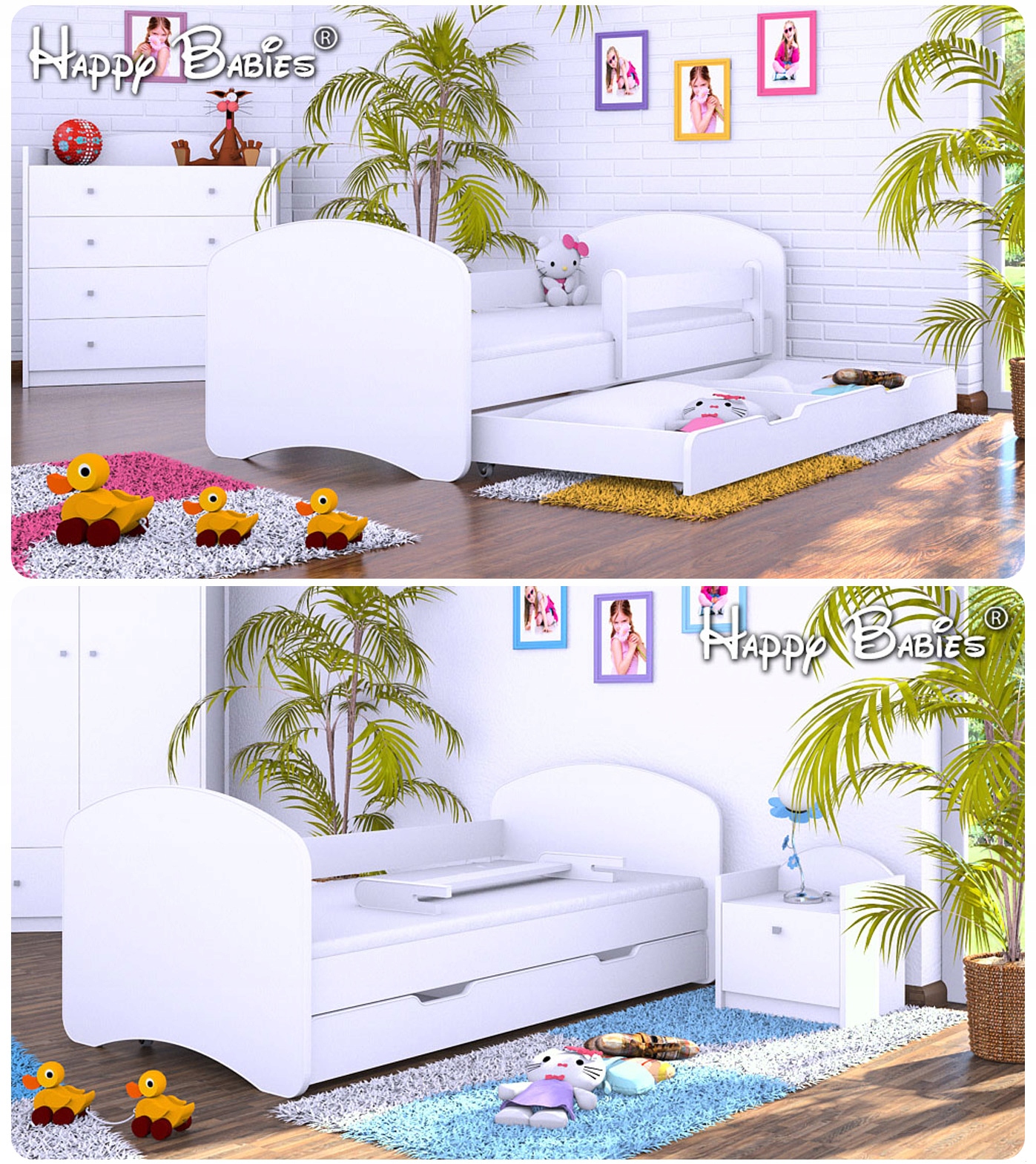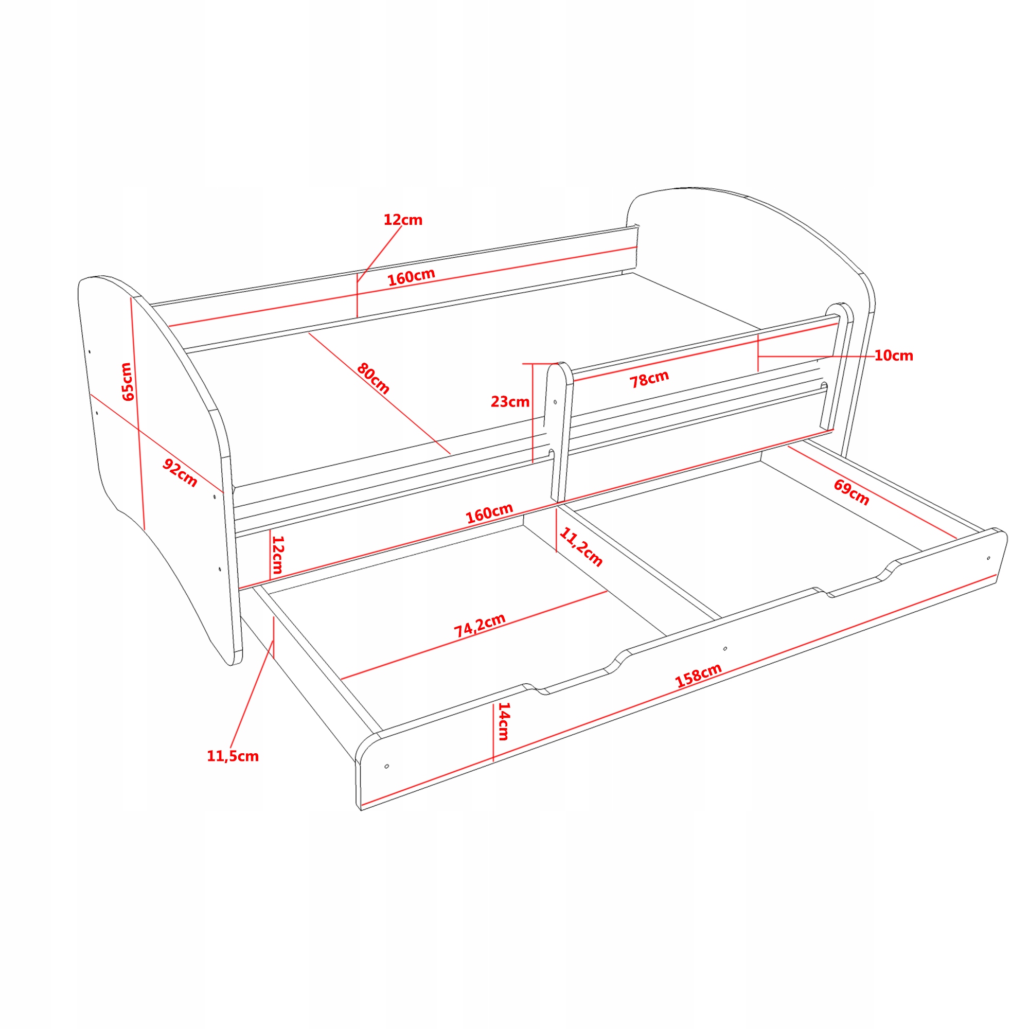 - Łóżko Happy - Powierzchnia spania: 160 cm x 80 cm, wymiar całkowity: 164 cm x 92 cm x 65 cm