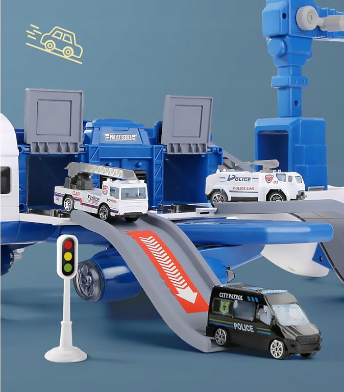 Gdy samolot wyląduje natychmiast przystępujemy do akcji. W szybkim tempie zamieniamy go w mobilny komisariat. Z zamykanych parkingów do akcji wyjeżdżają 4 metalowe wozy bojowe po opuszczanych zjazdach. Dodatkowo na górze znajduje się specjalna platforma gdzie po naciśnięciu przycisku wóz policyjny "wystrzeliwuje" się jak z procy by w ekspresowym tempie dotrzeć na miejsce zgłoszenia. Stawiamy obrotowy 360 stopni, dźwig z podnoszoną platformą. Platformę unosimy w górę lub opuszczamy w dół, za pomocą umieszczonego na dźwigu pokrętła.