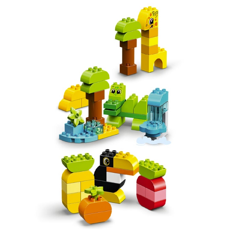 - Zestaw składa się ze 175 kolorowych klocków i elementów, z których można zbudować małpę, tygrysa, tukana, pandę, słonia, żyrafę, krokodyla, pingwina i wieloryba, a także trzy niezwykłe środowiska dla nich: Arktykę, dżunglę i sawannę.