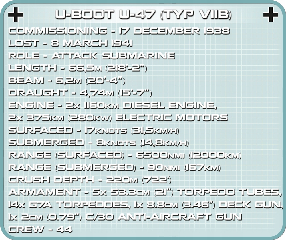 Model słynnego okrętu podwodnego został w całości zaprojektowany z polskich klocków konstrukcyjnych COBI w rewelacyjnej modelarskiej skali 1:144! Zestaw składa się z 422 elementów. Świetnie odwzorowany model U-47 mierzy aż 46 cm długości. Wszystkie detale i elementy graficzne to trwałe nadruki, które nie ścierają się nawet w trakcie intensywnego użytkowania.
