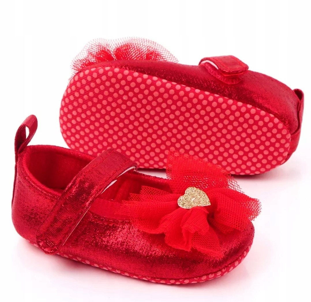 Cudne CZERWONE połyskujące balerinki niechodki ozdobione tiulowymi kokardkami.