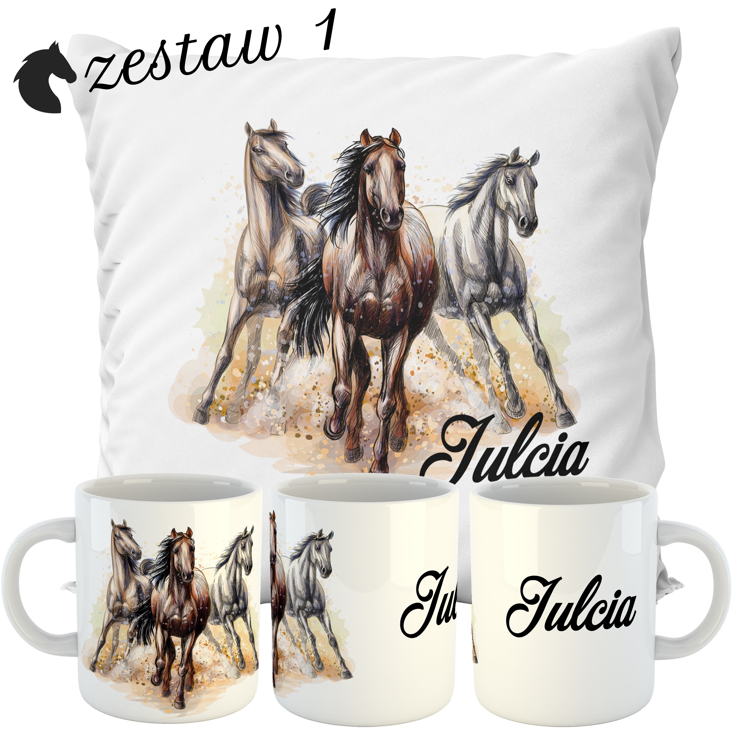 ZESTAW PODUSZKA + KUBEK z nadrukiem KONI + TWOJE IMIĘ!