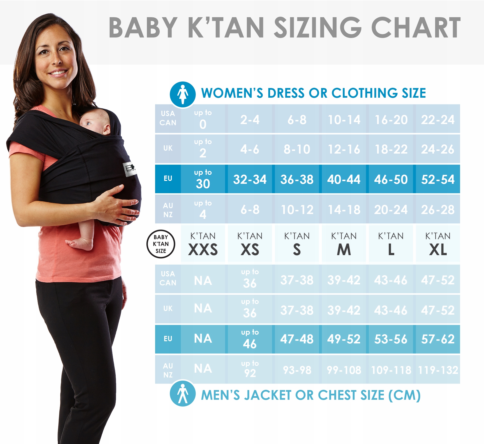 Baby K'tan ® ma rozmiar i nie ma żadnych sprzączek, zatrzasków ani pierścieni, które trzeba regulować. Kiedy kupisz odpowiedni rozmiar, Baby K'tan bezpiecznie dopasuje się do Ciebie oraz dziecka.