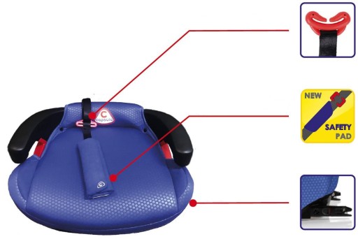 - Додатковий фіксатор ременя дозволяє індивідуально підлаштуватися під зріст дитини та гарантує, що діагональний ремінь безпеки автомобіля «не впинеться» в шию дитини