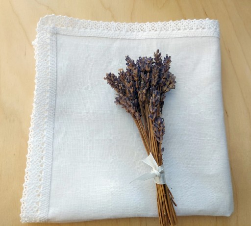Біла хустка виготовлена з білого льону, елегантної та благородної тканини, оздоблена білим бавовняним мереживом.