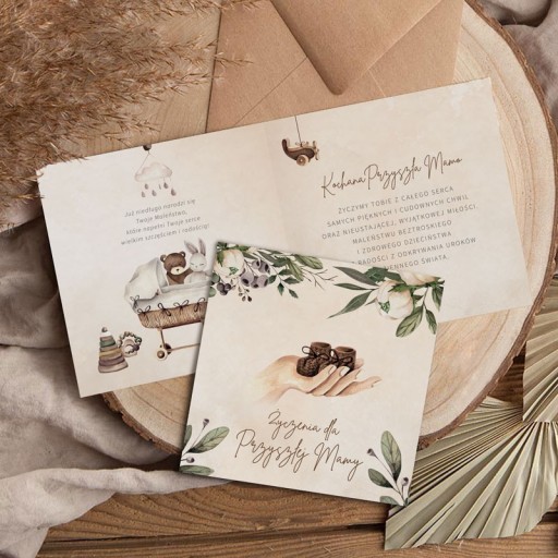 - композиція: відкривається листівка з побажаннями для Baby Shower, прикрашена мотивом у стилі бохо, виготовлена у формі для відкриття та продається в комплекті з крафтовим конвертом, який красиво завершує ціле