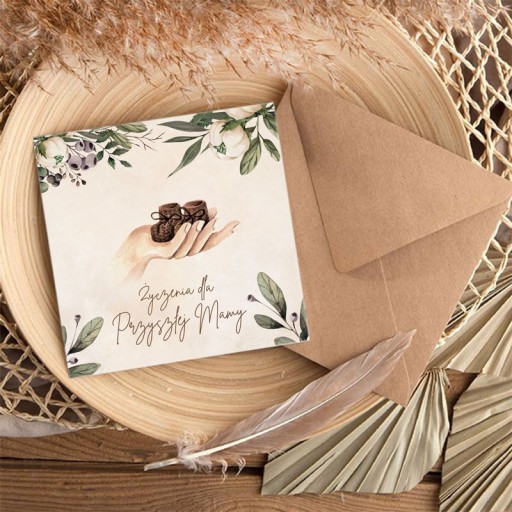Побажання майбутній мамі і малюкові потрібно дарувати оригінально і витончено. Прекрасним вибором для побажання всього найкращого у вашій новій спільній подорожі є листівка Baby Shower, оформлена в стилі бохо. Листівка має графіку милих дитячих туфель, виглядає красиво та унікально. У набір входить крафтовий конверт в тон.