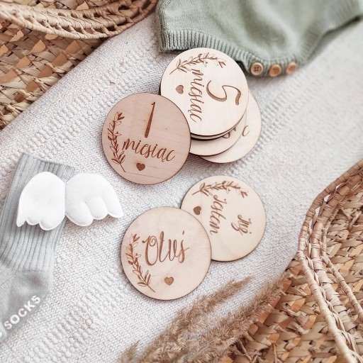 Представляємо гарний дерев'яний набір з 14 гравірованих пластин. Таблички є гарним доповненням до фотографій, що зафіксували перший рік життя дитини. Вони стануть ідеальним подарунком для майбутньої мами!