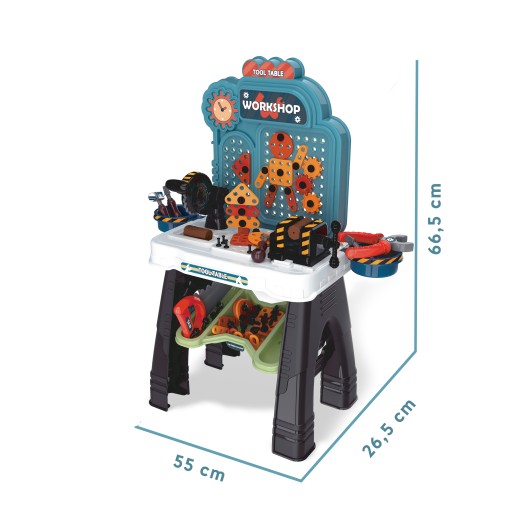 На стіні інструментального столика висить годинник, завдяки якому ваша дитинанавчитися називати години.Майстерня виконанадуже міцний,з особливим акцентом на окремі елементи.