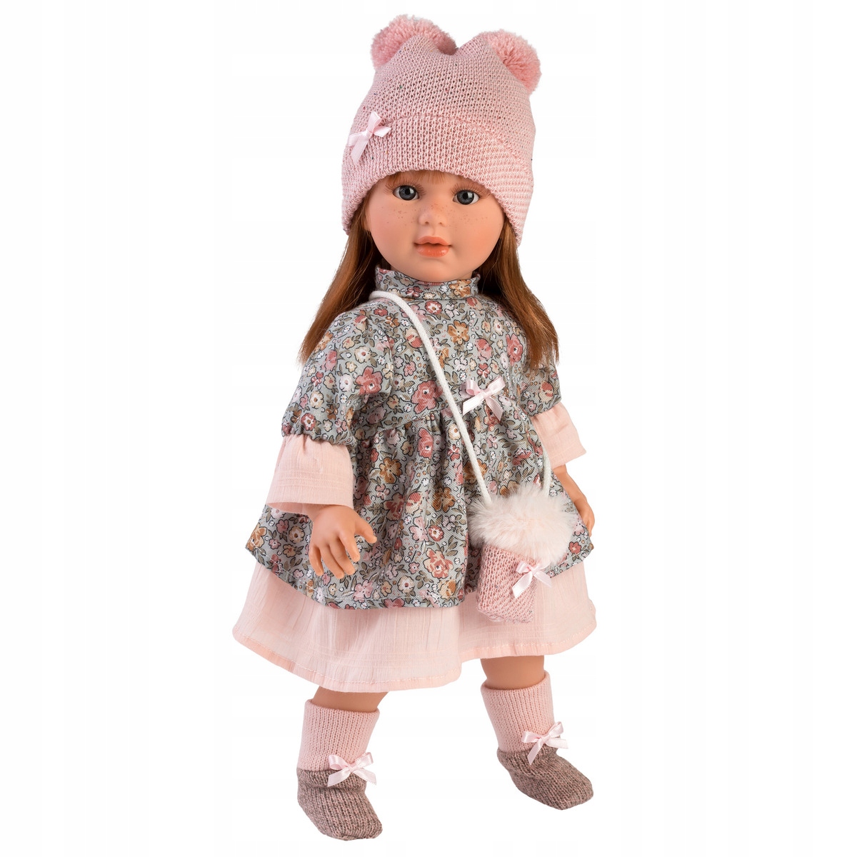 W naszej manufakturze wierzymy, że zabawa jest najlepszą nauką. Dlatego też z wielką miłością tworzymy kultowe lalki Llorens, w 100% ręcznie wykonane, o niepowtarzalnych wzorach. Stosowane przez nas tkaniny pochodzą od renomowanych marek odzieży dziecięcej. Wszystkie lalki Llorens są zgodne z europejskimi przepisami dotyczącymi bezpieczeństwa dzieci, co gwarantuje, że Twoje dzieci będą się bawić w możliwie najbezpieczniejszy sposób. Martina mierząca 40 cm posiada granatowe oczy, długie rzęsy, piegowate policzki i piękne rude włosy.Martina ubrana jest w kwiecistą sukienkę z łączonych materiałów, futrzaną kamizelkę, buty z kokardkami oraz różową czapkę z pomponami. Dopełnieniem stylizacji jest torebka pasująca do kompletu.Prawdziwy raj dla małych fashionistek.Jej rączki, nóżki i główka zostały wykonane z przyjemnego w dotyku winylu a brzuszek z materiału, wypełniony miękką wyściółką. Lalka została zapakowana w ozdobny karton. Kochamy hiszpańskie lalki Llorens!1,4340 cmWaga lalki:1,43Długość lalki:40 cmWielkość opakowania:26 x 50 x 16 cm 54034