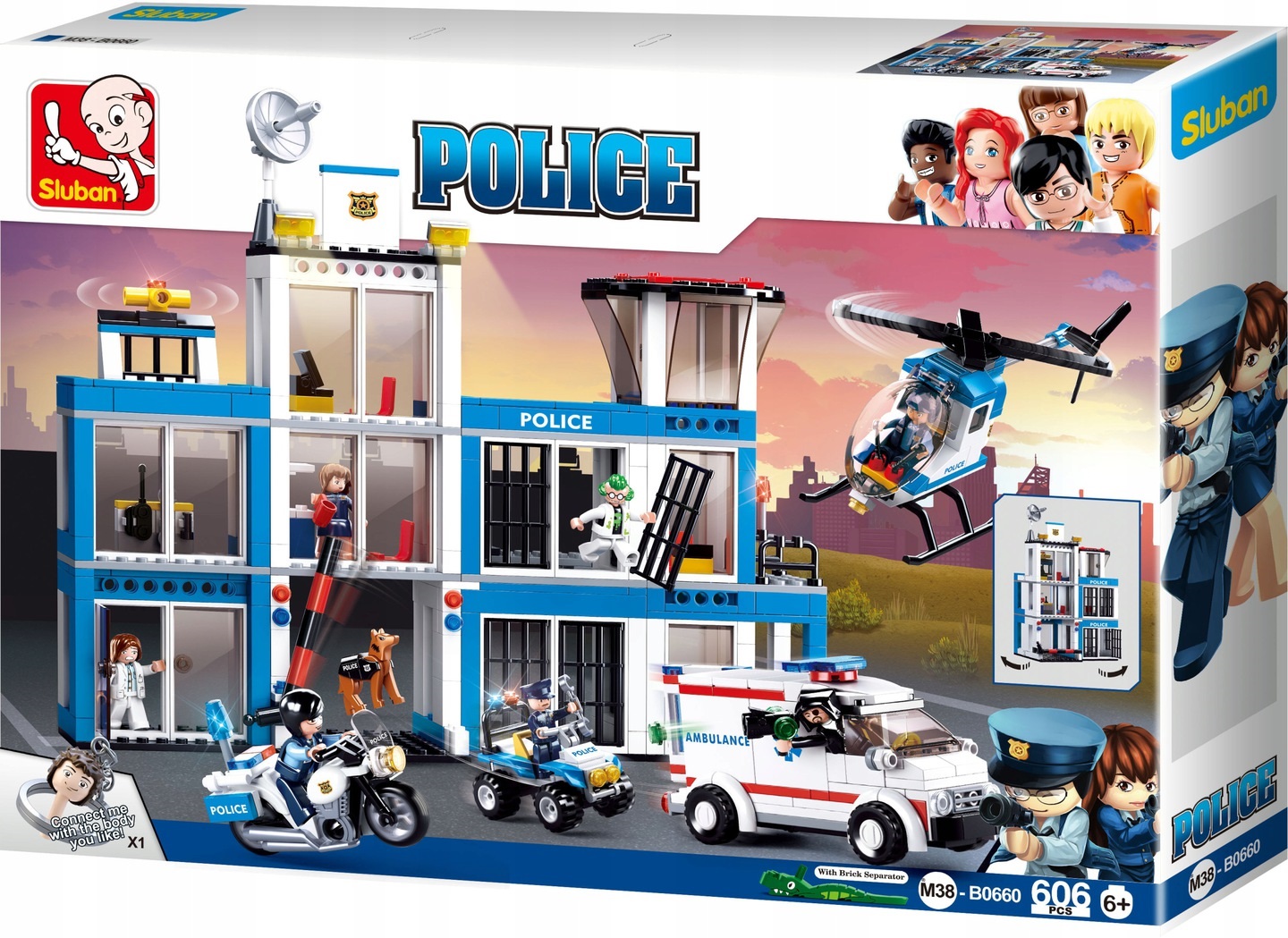 W zestawie znajdziemy 606 klocków, dzięki którym zbudujemy rozkładaną komendę policji, kilka pojazdów oraz helikopter.