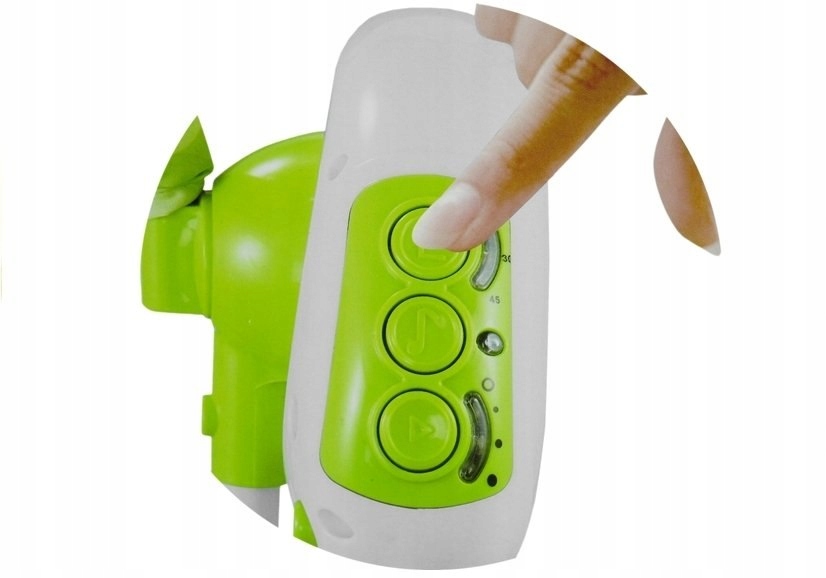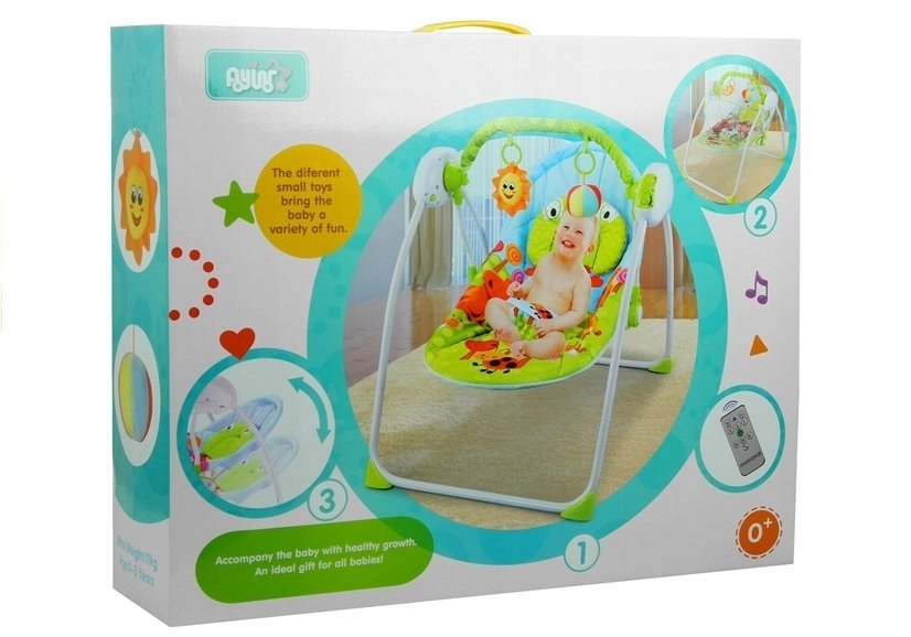 Bujaczek zasilany jest 4. sztukami baterii AA 1,5 V, które nie są dołączone do zestawu. Należy umieścić je w zielonym panelu z przyciskami, co umożliwi korzystanie z dodatkowych funkcji bez użycia pilota. Fotelik został wykonany z dbałością o najmniejsze detale z wysokogatunkowych materiałów, w połączeniu z oznakowaniem certyfikatem CE gwarantuje niezawodność i solidność produktu. Leżaczek dla maluszka zapakowany jest w estetyczny, kolorowy kartonik z rączką ułatwiającą przenoszenie.