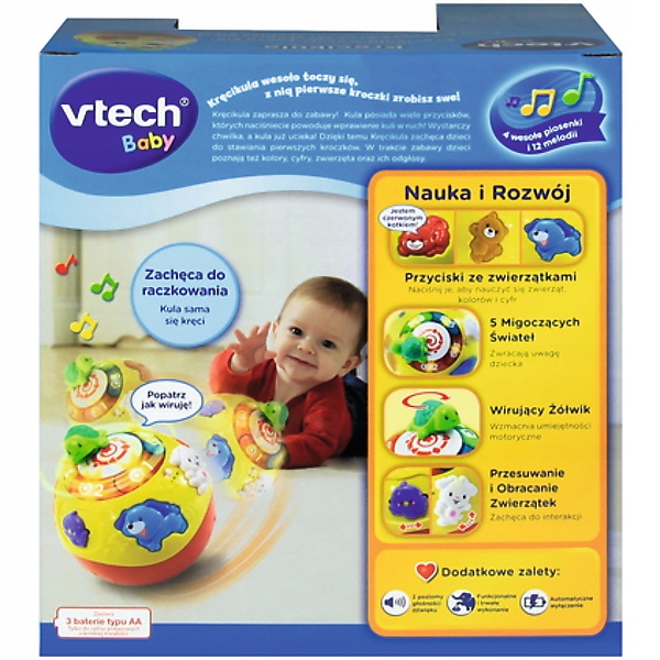 - Kiedy dzieci usiądą przy kuli, mogą przyciskać guziki. Usłyszą wówczas nazwy cyfr, zwierzątek, a także zabawne piosenki i melodie. Zabawka zapozna również z podstawowymi kształtami i kolorami. Kręcikula świetnie symuluje zmysł dotyku, dzięki wypukłym zwierzątkom oraz wystającym tasiemkom.