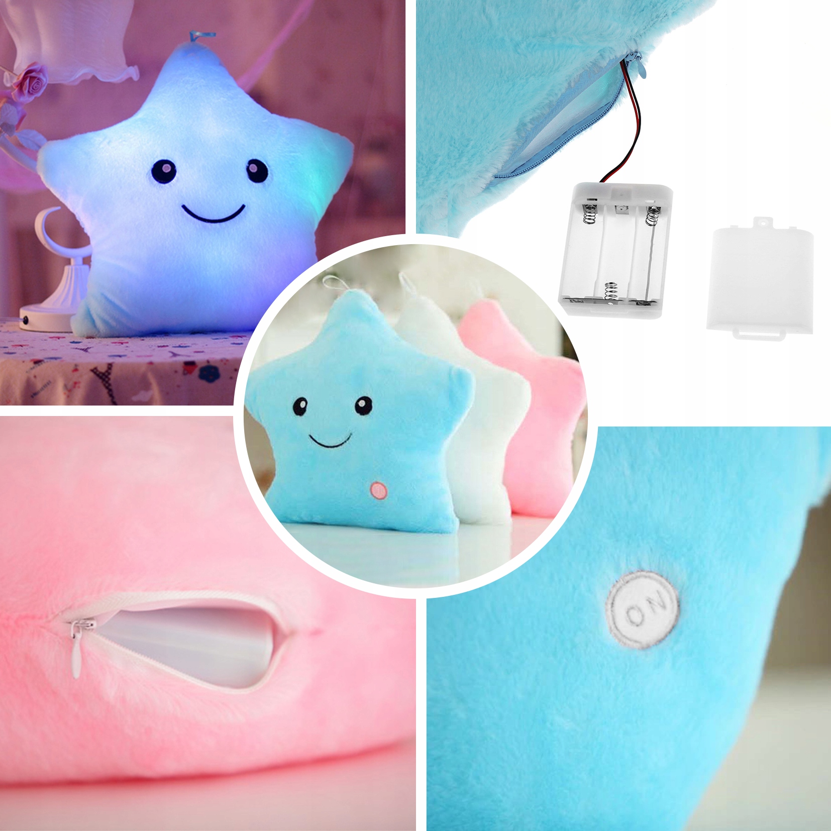 Świecące światłem LED, które po włączeniu zmieniają odcienie. Przycisk od włączenia oraz wyłączenia znajduje się w rogu poduszki. Poduszka posiada zamek błyskawiczny, do akumulatora i aplikacji baterii.