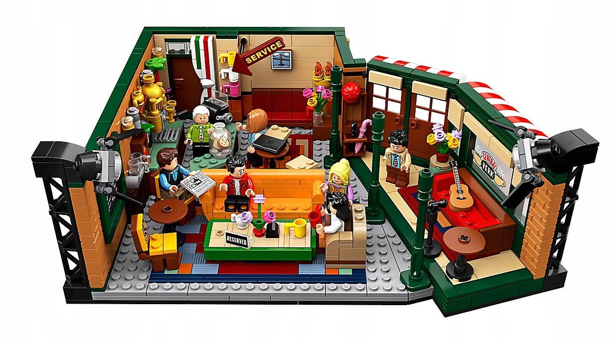 - W zestawie konstrukcyjnym z kawiarnią CENTRAL PERK znajdziesz kultową strefę wypoczynkową z sofą, fotelem, dwoma krzesłami i stołem, strefę obsługi z ekspresem z klocków, ladą, kasą, słojem z dwoma ciasteczkami, tablicą z menu oraz innymi realistycznymi detalami, scenę do występów muzycznych z sofą, dodatkowymi fotelami i stolikiem, trzy filary w kolorze, który będzie dostępny dopiero od września 2019 r., stojak z dwoma parasolami, okno z logo CENTRAL PERK, drzwi wejściowe oraz dwie zbudowane z klocków lampy studyjne z przezroczystymi elementami światła.
