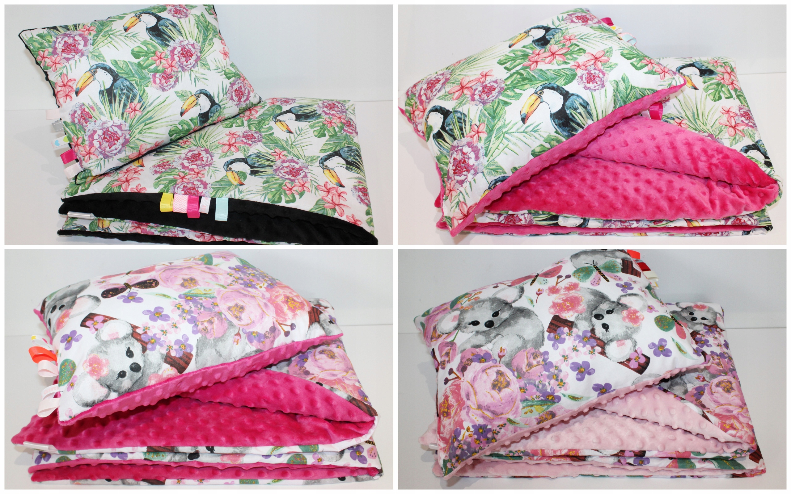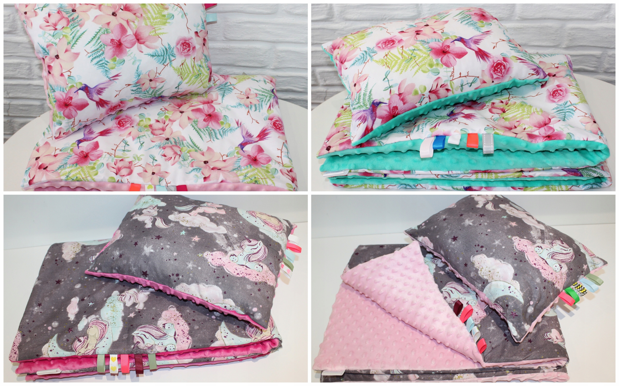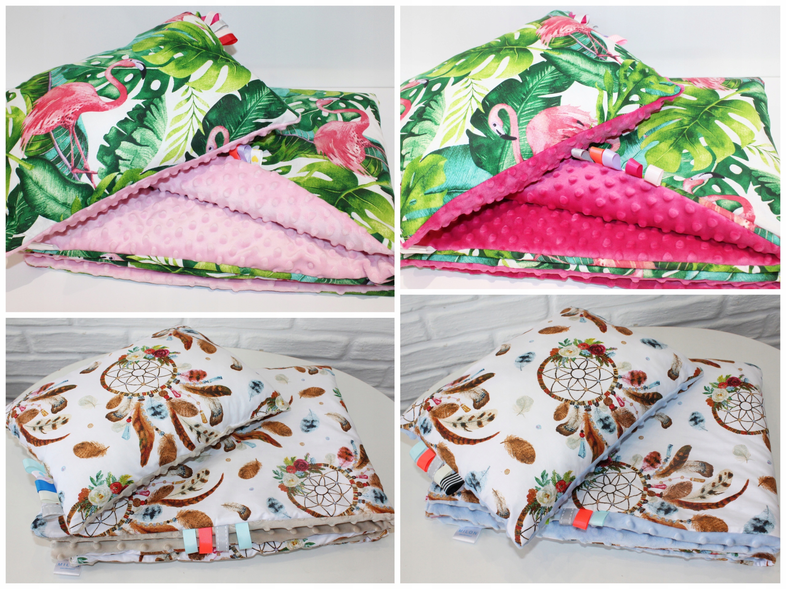 Dodatkowo przyszyte kolorowe tasiemki uatrakcyjniają komplet Minky, wspomagają rozwój motoryczny dziecka (na życzenie Klienta szyjemy bez tasiemek)