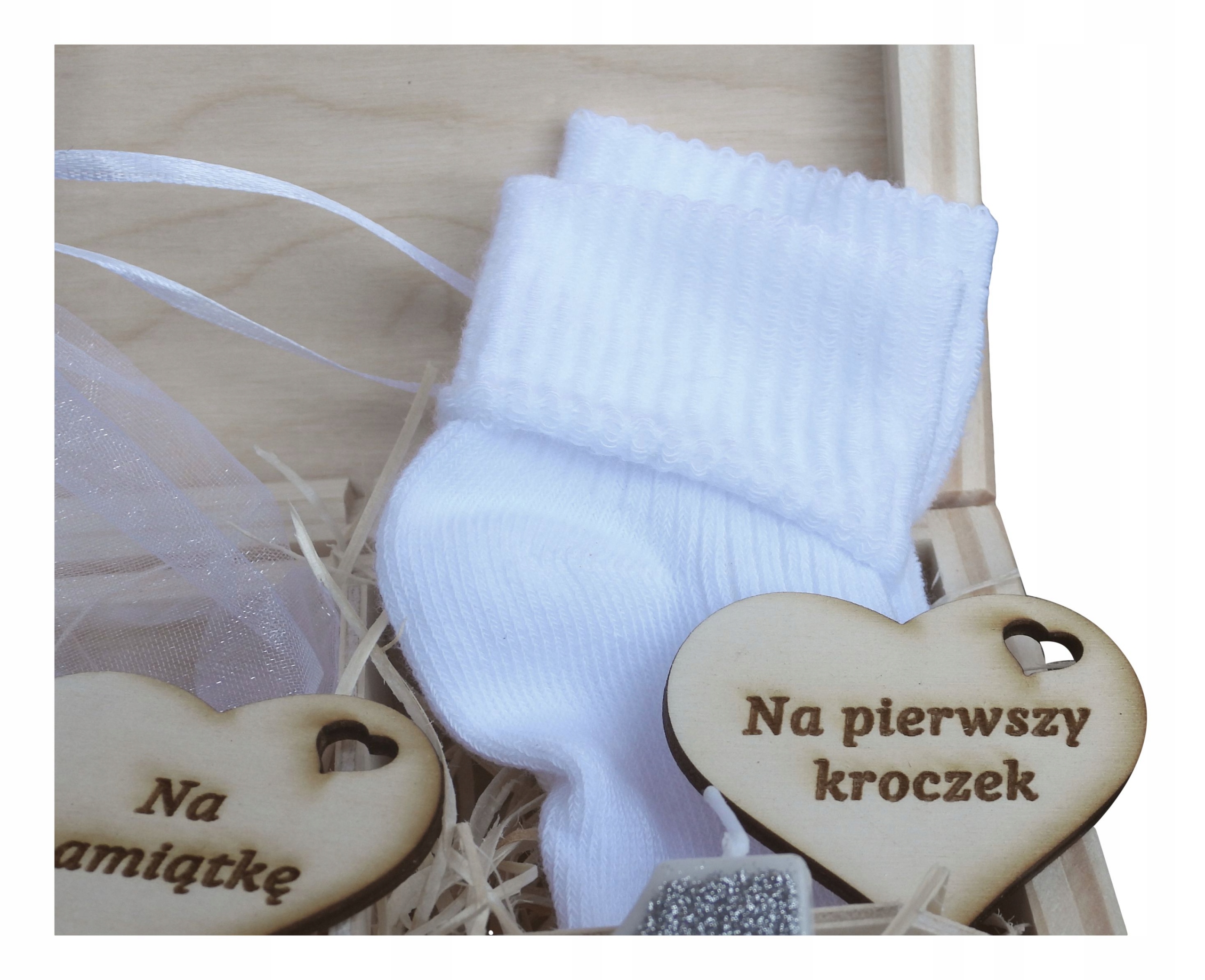 - Wyposażenie - srebrna świeczka na roczek, piękny różaniec z motywem sakralnym, piękne białe skarpetki, biały woreczek gdzie włożysz gotówkę, pudełeczko na pierwszy ząbek, kupo lotto