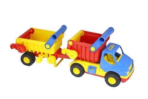 Zarówno wywrotka jak i jej przyczepa posiadają po cztery koła z gumowymi oponami.