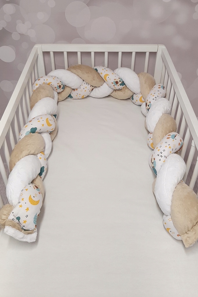 * Ochraniacza w kształcie warkocza 200x20cm (1 splot z bawełny w śpiące misie, 1 splot z minky jasny beż, 1 splot z minky białego),