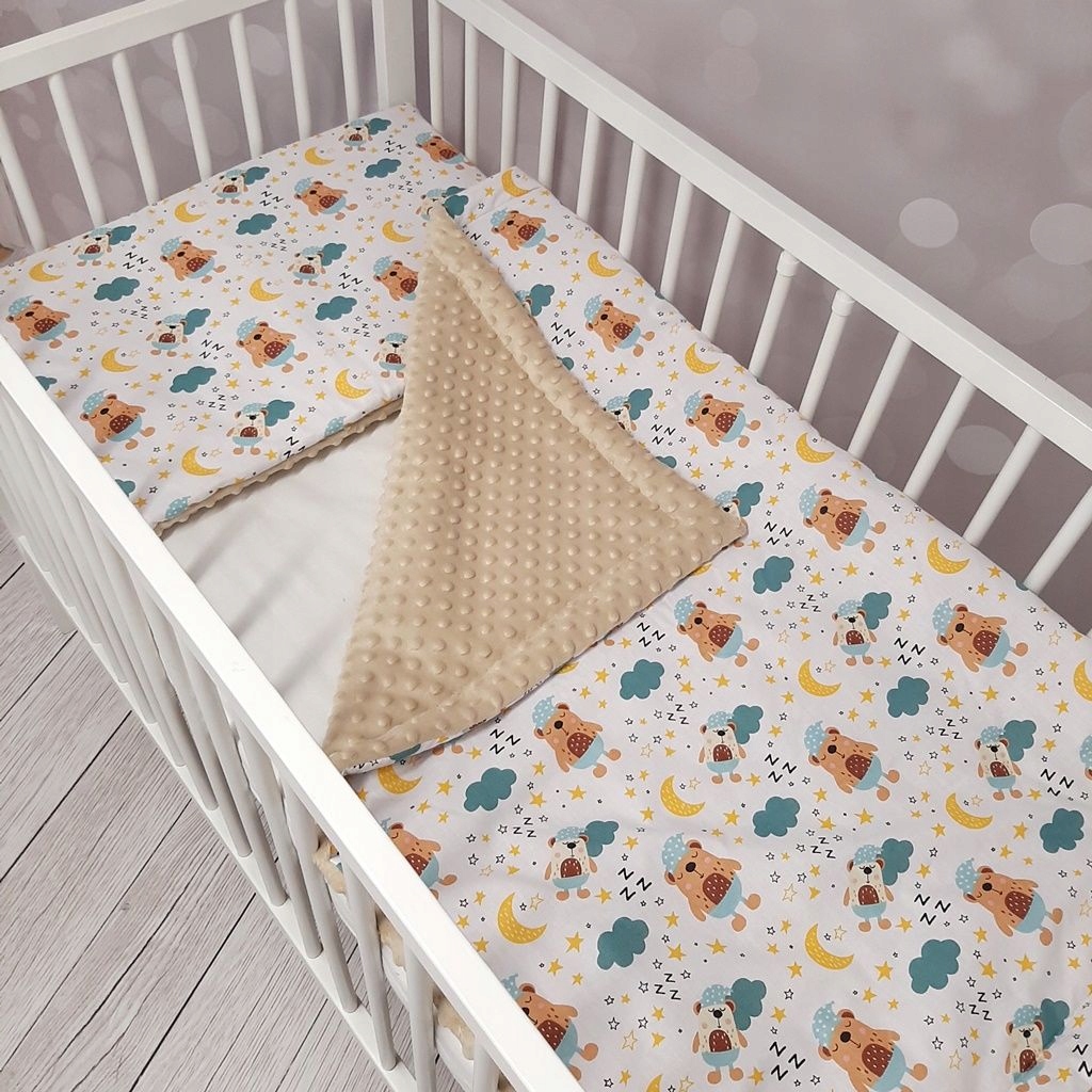 Zestaw jest mięciutki, przyjemny w dotyku i antyalergiczny. Praktyczne elementy zestawu zapewnią maluszkowi jednocześnie spokojny i bezpieczny sen oraz przytulne i cieplutkie warunki. Jego atutem jest piękny wzór w śpiące misie, który dodatkowo ozdobi i ożywi dziecięce łóżeczko.