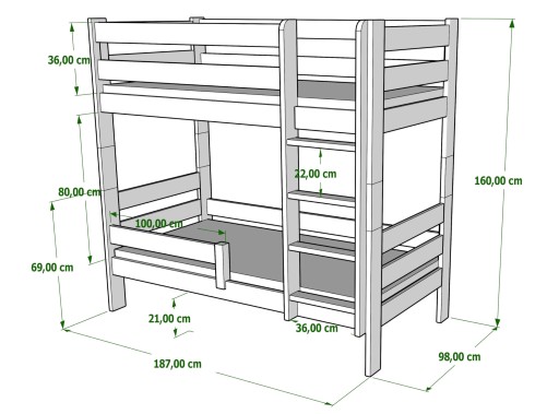 GAGATEK - це двоповерхове ліжко, повністю виготовлене з високоякісної сосни. Він ідеально підходить для кімнати братів і сестер, коли вам потрібно оптимально використовувати простір, який поділяють ваші діти. Захисні дерев'яні поручні запобігають падінню, а діти можуть безпечно та зручно підійматися по драбині з плоскими щаблями. Також можливе використання версії GAGATKA з двома незалежними петлями. колесо, яке можна складати та розбирати багато разів, без шкоди для його міцності та естетики