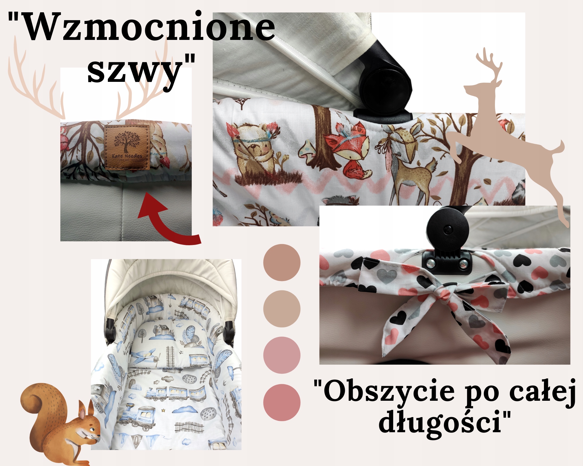 - Dopasowane wywinięcie możliwe dzięki wszytej mocnej gumie wewnątrz wkładu. Całość naciągają państwo według uznania wszytymi trokami, które tworzą ozdobne kokardy po obu stronach wózka.