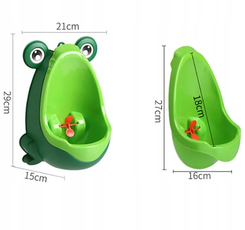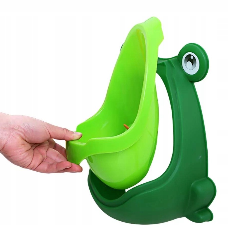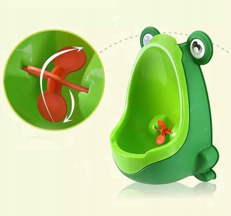 Mini pisuar w kształcie żaby dla chłopca. Kształt żabki, kolory i obracający się wiatrak pomogą w nauce samodzielności.Posiada wyjmowany wkład ze specjalnym uchwytem, dzięki czemu można łatwo i wygodnie opróżnić i umyć pisuar.