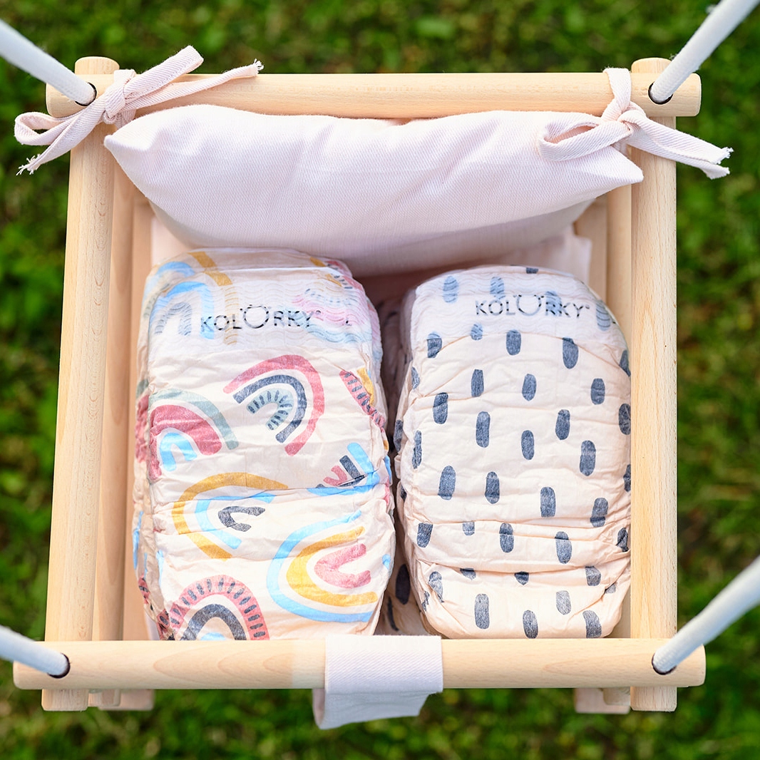 Kolorky DAY Rain&Rainbows to jednorazowe pieluszki, które powstały z dbałości o zdrowie dzieci i z troski o środowisko. To wyrazisty i oryginalny design uzyskany za pomocą bezpiecznych farb wodnych, który tworzy piękne chwile nawet podczas zwykłej zmiany pieluszki. Kolorky Day występują w kilku wzorach, w rozmiarach S - XL. Proces ich bielenia odbywa się za pomocą metody TCF (total chlorine free). Nie zawierają szkodliwych substancji takich jak ftalany, PVC, lateks i chlor. Dzięki niezwykłej przepuszczalności powietrza oraz nietkanym, ekologicznie czystym materiałom, idealnie nadają się do bardzo wrażliwej skóry. Kolorky DAY ulegają biodegradacji w 73-77%, w zależności od rozmiaru pieluchy.