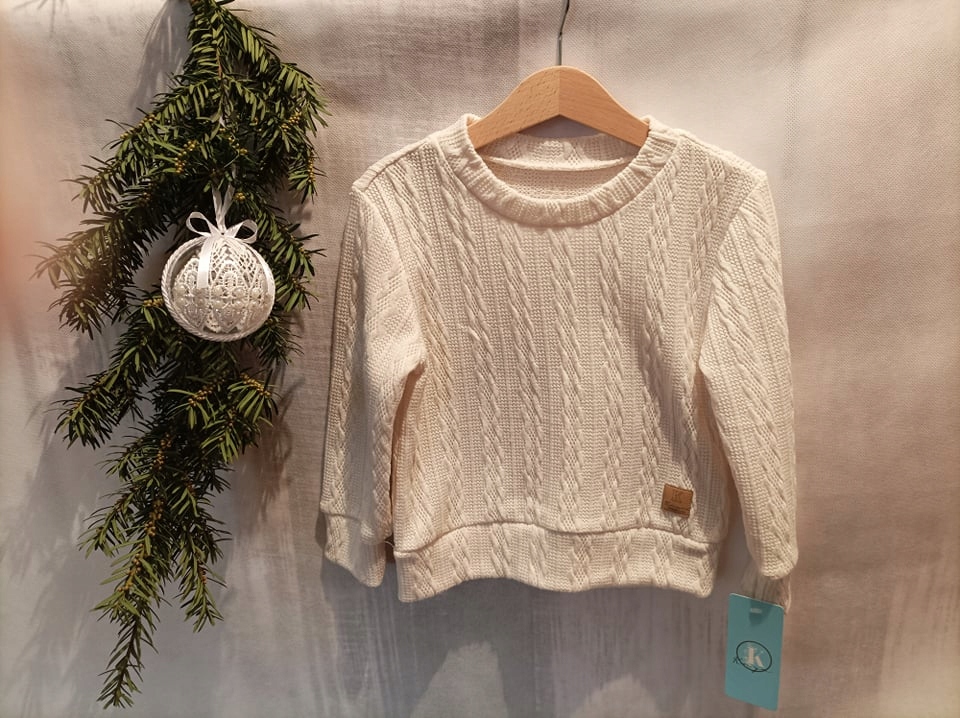 Piękny sweterek dla chłopca. Sweterek jest kremowy. Zakładany przez głowę. Idealny na świąteczne sesje. Mięciutki i bardzo stylowy. Dzięki wykorzystaniu wysokiej jakości materiałów sweterek jest bardzo wygodny. Nadaje się na sezon jesienny, zimowy jak i wczesną wiosną. 100% bawełna
