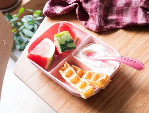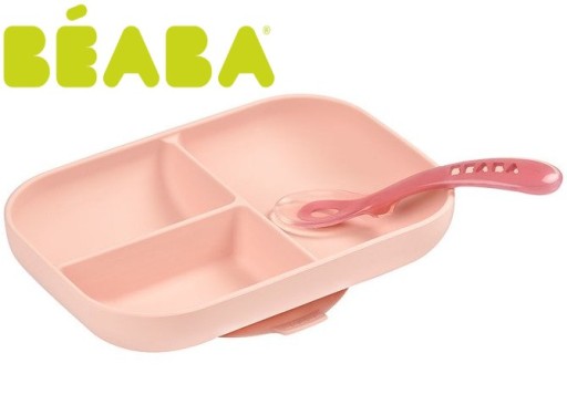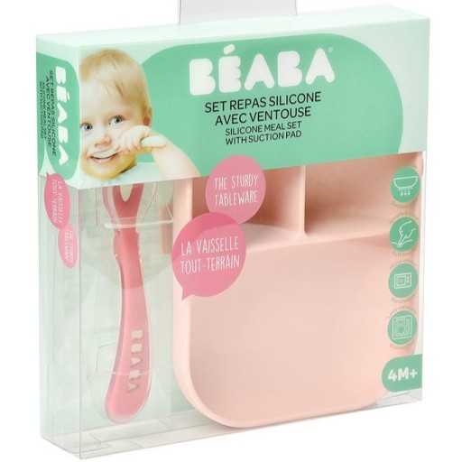 Набір силіконового посуду від французького бренду Beaba складається з великої тарілки-миски з трьох частин і навчальної ложки. Всі елементи набору характеризуються ергономічною округлою формою і м'якими гладкими краями. Поділ тарілки на три частини (150 мл + 90 мл + 90 мл) дозволяє розділити їжу на порції, завдяки чому вашій дитині буде легше навчитися самостійно харчуватися і правильно складати страви. Високі бортики допомагають дитині їсти їжу самостійно. Блюдо має протиковзку присоску на дні, що робить його стійким і добре тримає стіл. Ложка ідеально поміщається в рот дитини, її можна опустити так, щоб голова не торкалася поверхні, що робить її використання набагато гігієнічнішим. Набір рожевих відтінків (блакитна тарілка і рожева ложка). Його можна мити вручну і в посудомийній машині, а також можна розігріти в мікрохвильовій печі.