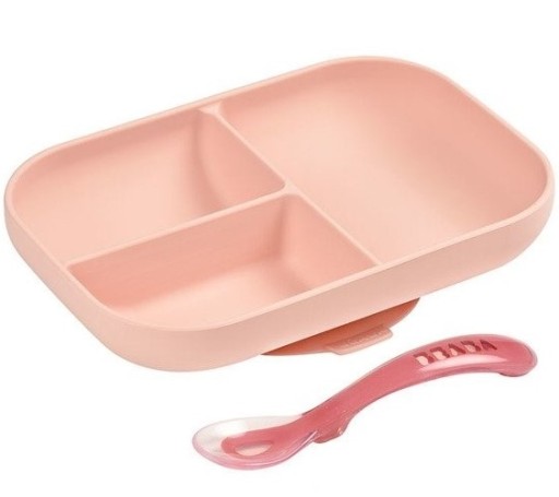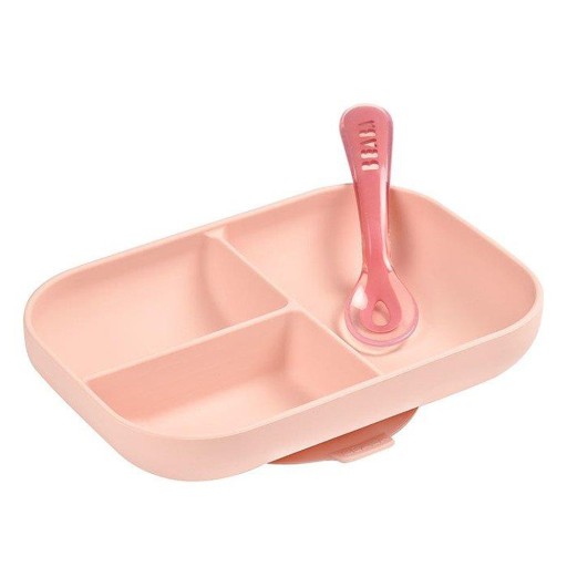 Beaba Набір силіконового посуду тарілка три частини з присоскою + ложка Рожевий