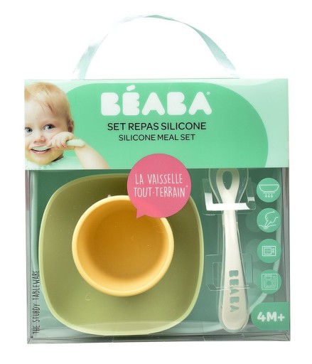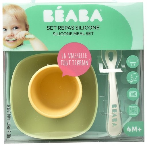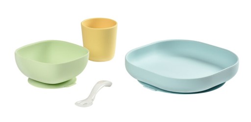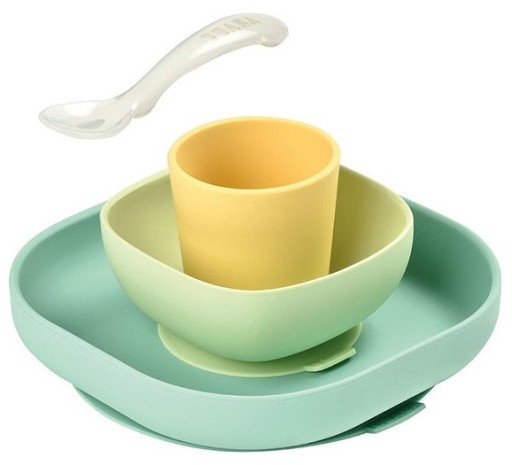Набір силіконового посуду від французького бренду BEABA складається з тарілки, миски, кухля і навчальної ложки. Всі елементи набору характеризуються ергономічною округлою формою і м'якими гладкими краями. Високі борти миски та тарілки полегшують дитині самостійно зачерпувати їжу на виделку чи ложку. Цей посуд має нековзку присоску на дні, що робить його стійким і добре тримає стіл. Чашка зручна і зручна для навчання пити, а ложка ідеально лягає в рот дитини і її можна опустити так, щоб голова не торкалася поверхні, що робить її використання набагато гігієнічнішим. Набір пастельних тонів: тарілка світло-блакитна, миска світло-зелена, чашка світло-жовта, ложка біла. Посуд можна мити вручну, в посудомийній машині, розігрівати в мікрохвильовій печі.