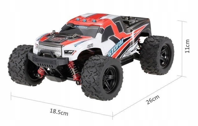 Storm to model terenowy w skali 1:18. Samochód przeznaczony głównie do jazdy terenowy, ale świetnie radzi sobie też na równym i twardym podłożu. Pomimo skali 1:18 Storm ma 27cm długości, co jest całkiem dobrym wynikiem. Będzie to zdecydowanie najlepszy model dla początkujących, ale zaawansowani modelarze również wycisną z niego sporo frajdy.