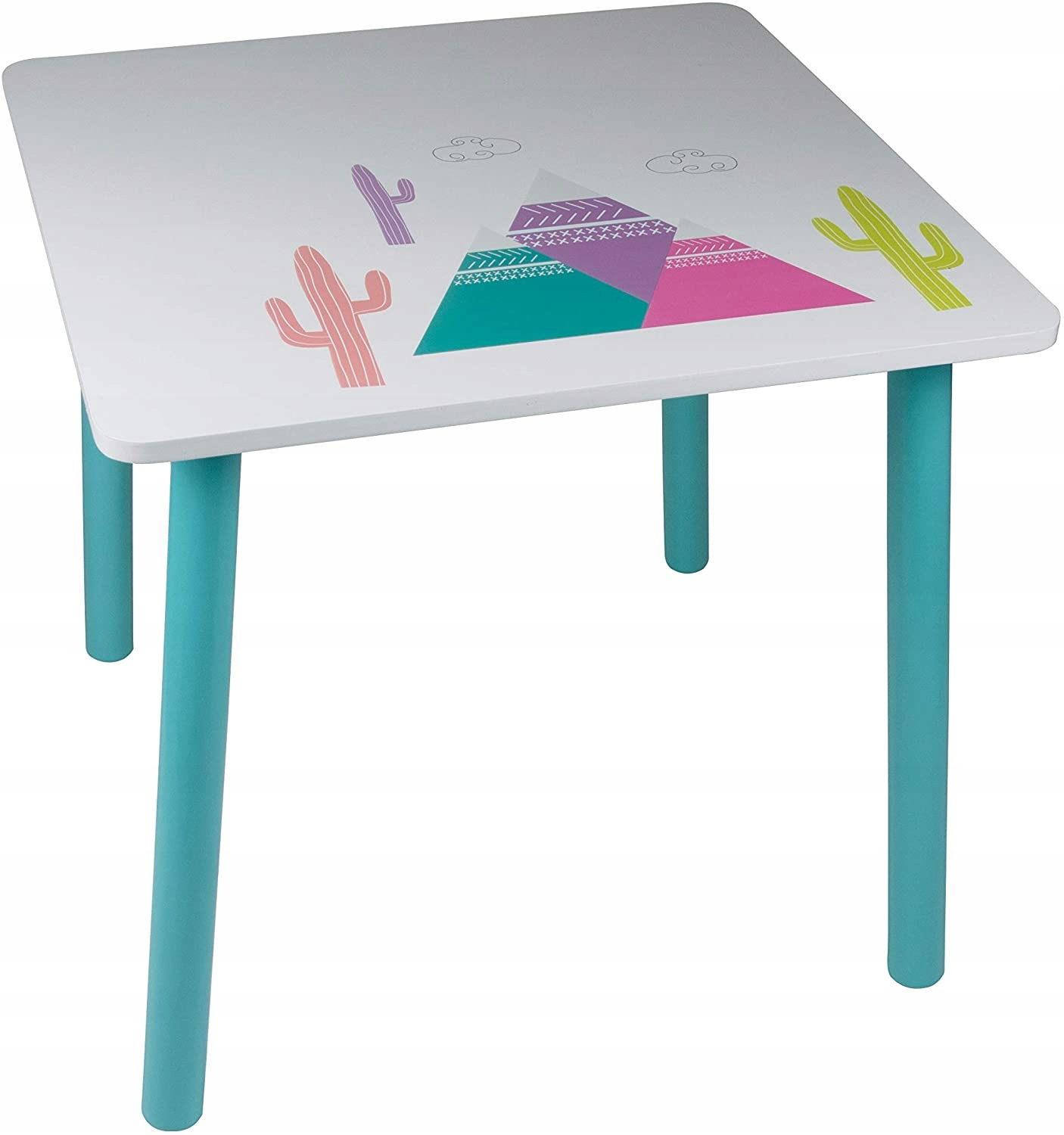 Stolik i krzesła estetycznie ozdobione kolorowymi motywami .Wykonany z drewna MDF. Wszystkie krawędzie stolika zostały wygładzone z myślą o bezpieczeństwie dziecka.