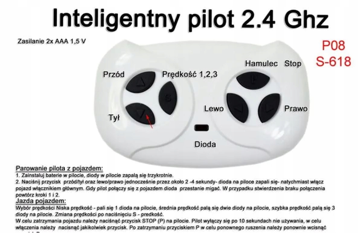 Pilot 2.4G przed pierwszym użyciem musi być zakodowany (bez tego pilot nie działa). Instrukcja kodowania na drugiej stronie pilota. Prosta sprawa, przytrzymać wskazany przycisk na pilocie ok.3-4 sekundy , aż lampki zaczną mrugać i w tym samym momencie uruchomić auto z przycisku.