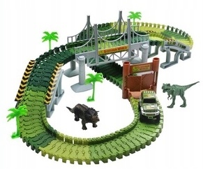 Tor samochodowy z samochodem na baterie i dinozaurami.