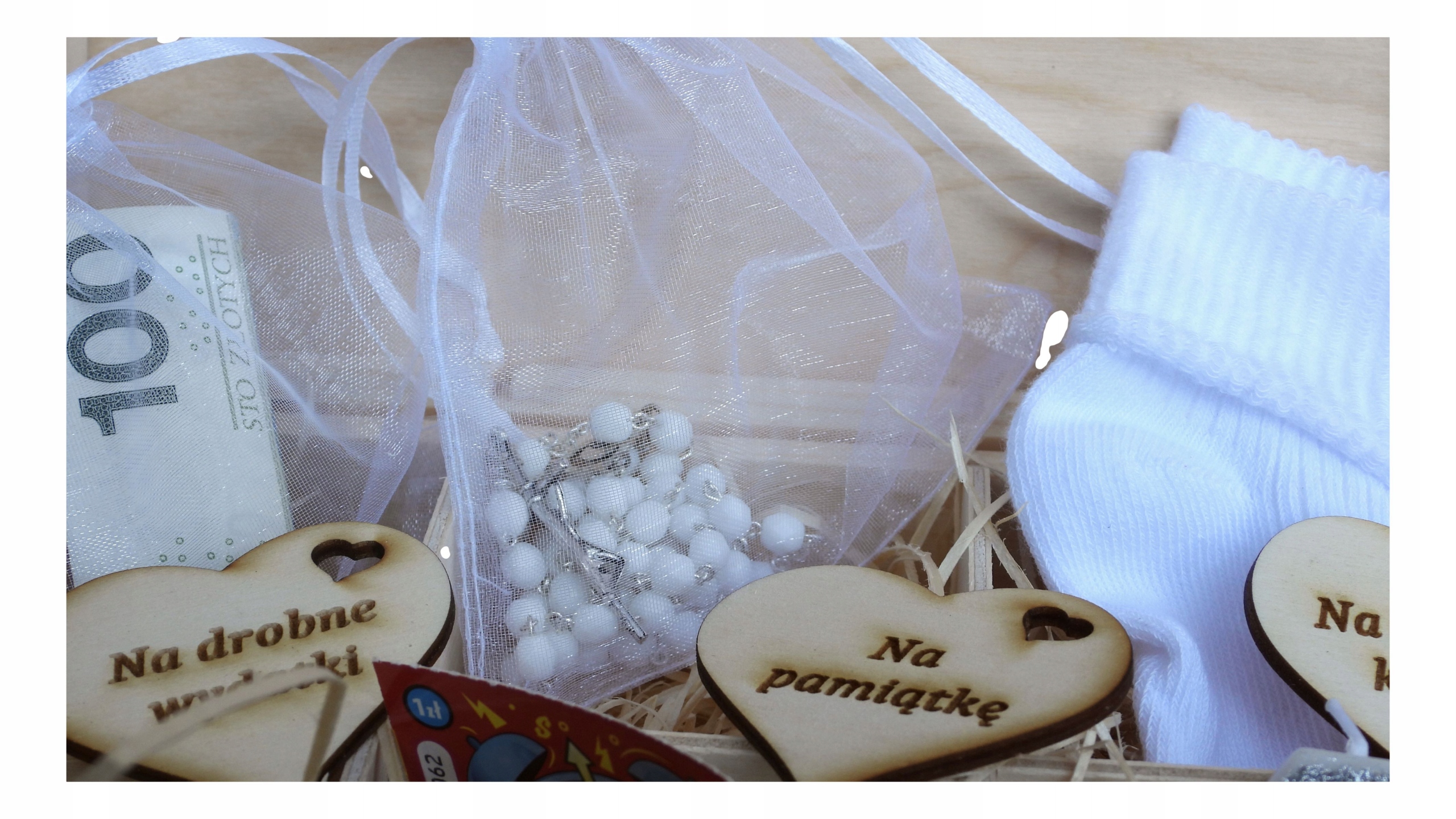- Wyposażenie - srebrna świeczka na roczek, piękny różaniec z motywem sakralnym, piękne białe skarpetki, biały woreczek gdzie włożysz gotówkę, pudełeczko na pierwszy ząbek, kupo lotto